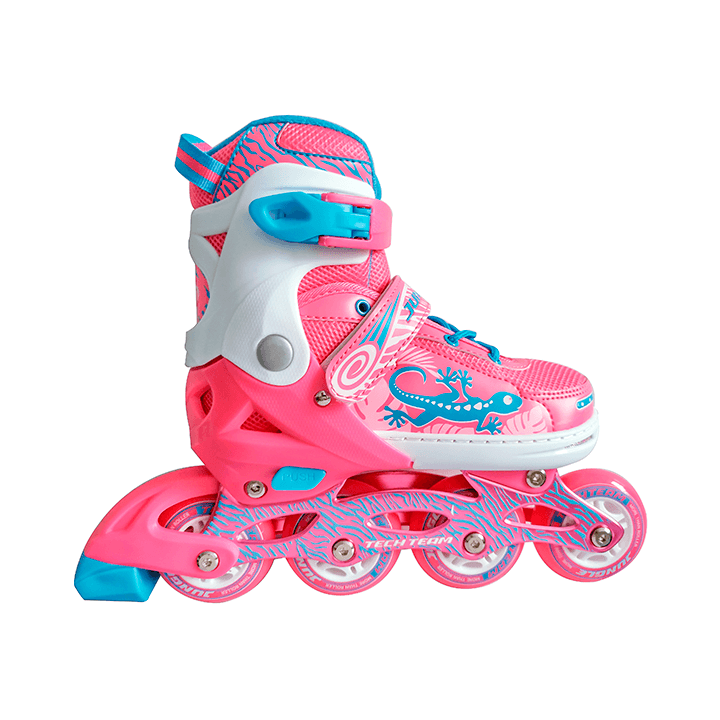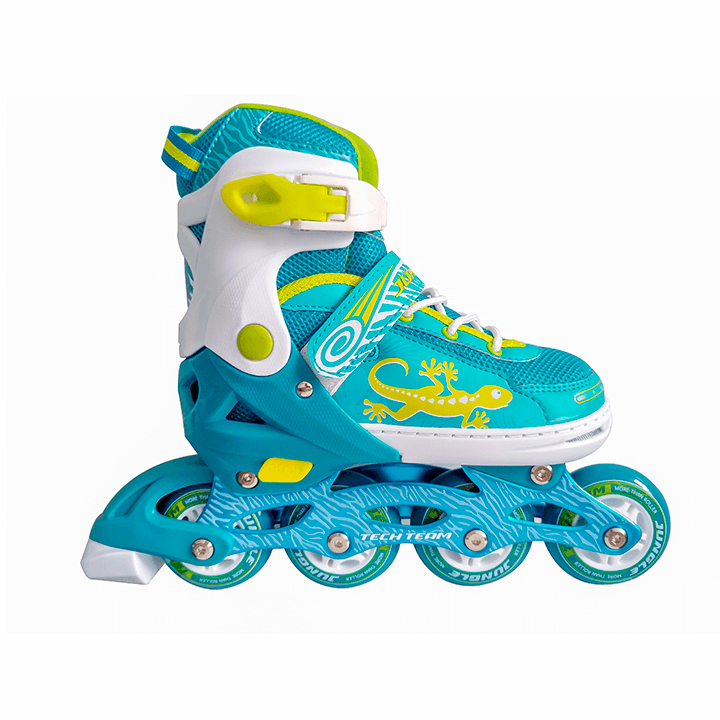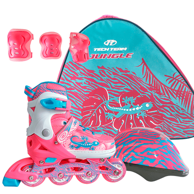 Jungle Set 2019 — детский набор роликовых коньков, в котором есть все, что необходимо вашему малышу для катания: ролики; шлем; зашита локтей, кистей, колен; удобная сумка-переноска. Прекрасно подойдет в подарок: даже если у вас нет возможности примерить набор, не бойтесь ошибиться — ролики раздвигаются в диапазоне 4 размеров. Три ярких расцветки на выбор: розовый набор, синий и бирюзовый!