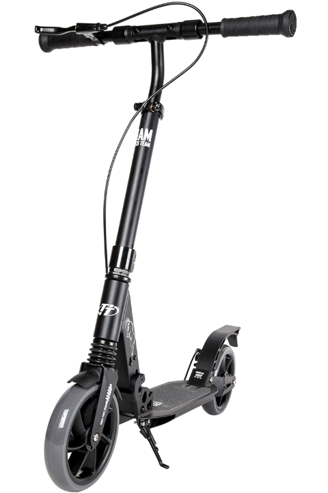 Прочная алюминиевая дека шириной 13.6 см и длиной 46 см покрыта износостойкой шкуркой (рабочая часть деки "footspace" - 33,5 см). Для удобства парковки самокат оборудован складывающейся подножкой.