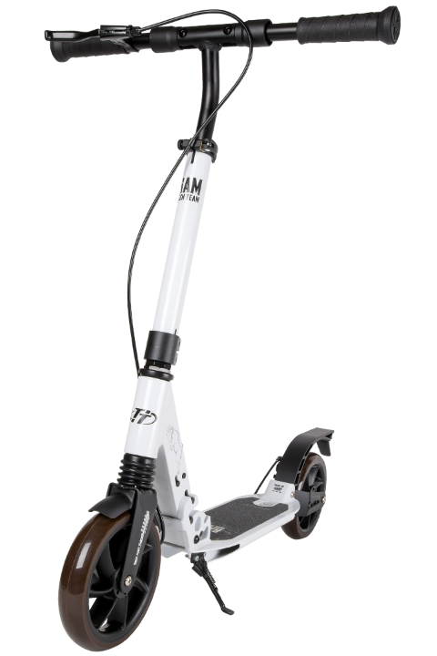 Прочная алюминиевая дека шириной 13.6 см и длиной 46 см покрыта износостойкой шкуркой (рабочая часть деки "footspace" - 33,5 см). Для удобства парковки самокат оборудован складывающейся подножкой.